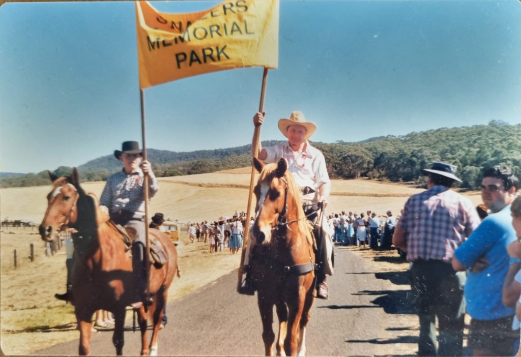 The Swanfels Pioneer Memorial Park was officially opened on 26 April 1986 by Isabella Zachrisen, the oldest living person born in the valley. Over 1,500 people attended the opening, which featured a parade from Mahony’s to the park. Visitors were encouraged to dress in period clothing. Following this, there was a stock brand burning ceremony at the brand post, a crosscut sawing competition, the dedication of a cross, and an open-air dance on the tennis courts in the evening.