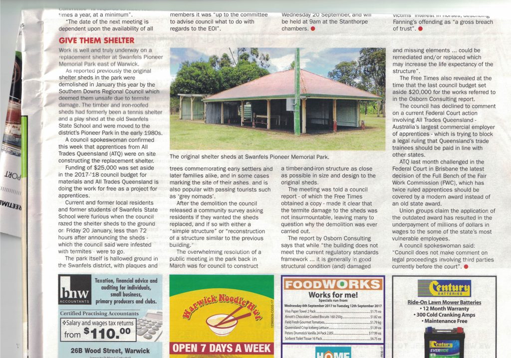In recent years, the Council allowed termite damage to a small section of the playshed’s roof. Locals had planned to repair it with volunteer labour, but in December 2016, the Southern Downs Regional Council (SDRC) commissioned Osborne Engineers to inspect the shed. The report highlighted termite damage to the rafters, and the Council allocated $20,000 for repairs.