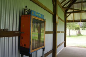 The shed was moved to Swanfels Park on 19 July 1985 for $600, funded entirely by donations and fundraising. Volunteers also contributed by fencing the reserve, planting trees, and completing other improvements, such as installing a grid and erecting the entrance timber, which came from the valley. The wheels came from the wagon of “Peter the Dane”, one of the early teamsters and the steel in the grid from the old Yangan railway line.